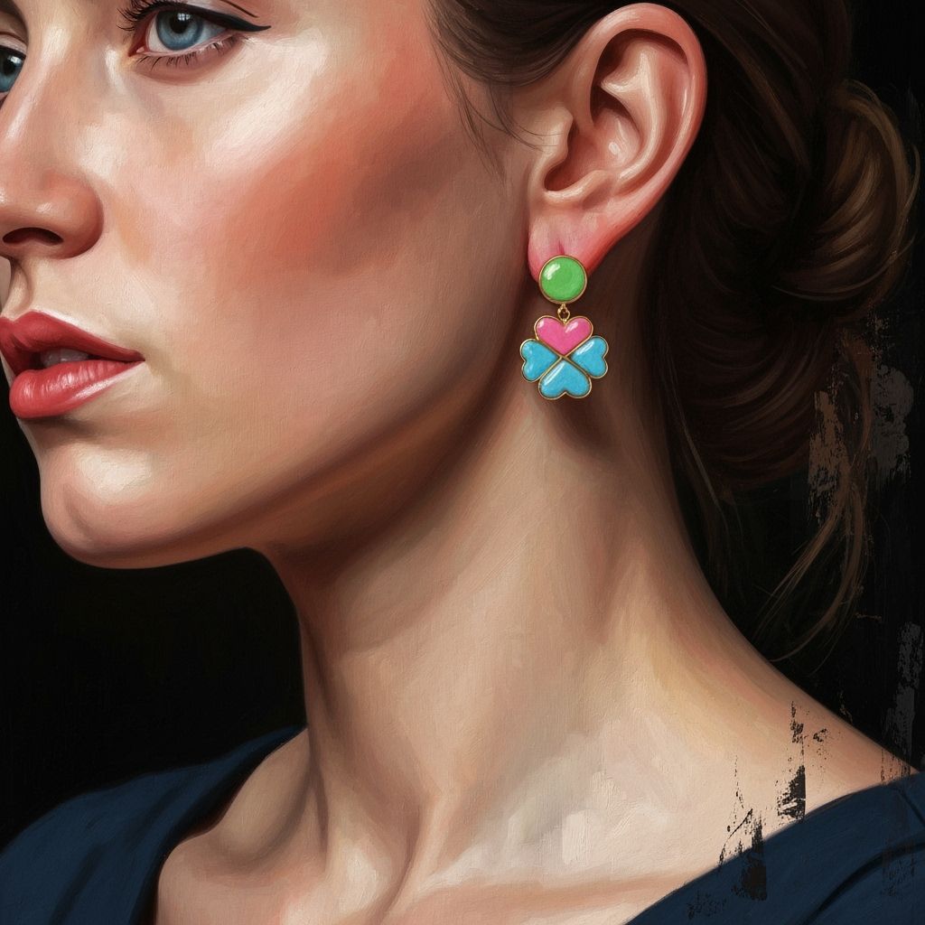 A portrait of a woman wearing distinctive earrings. The image features the textures of rough paint strokes and dramatic lighting, reminiscent of an oil on canvas painting.