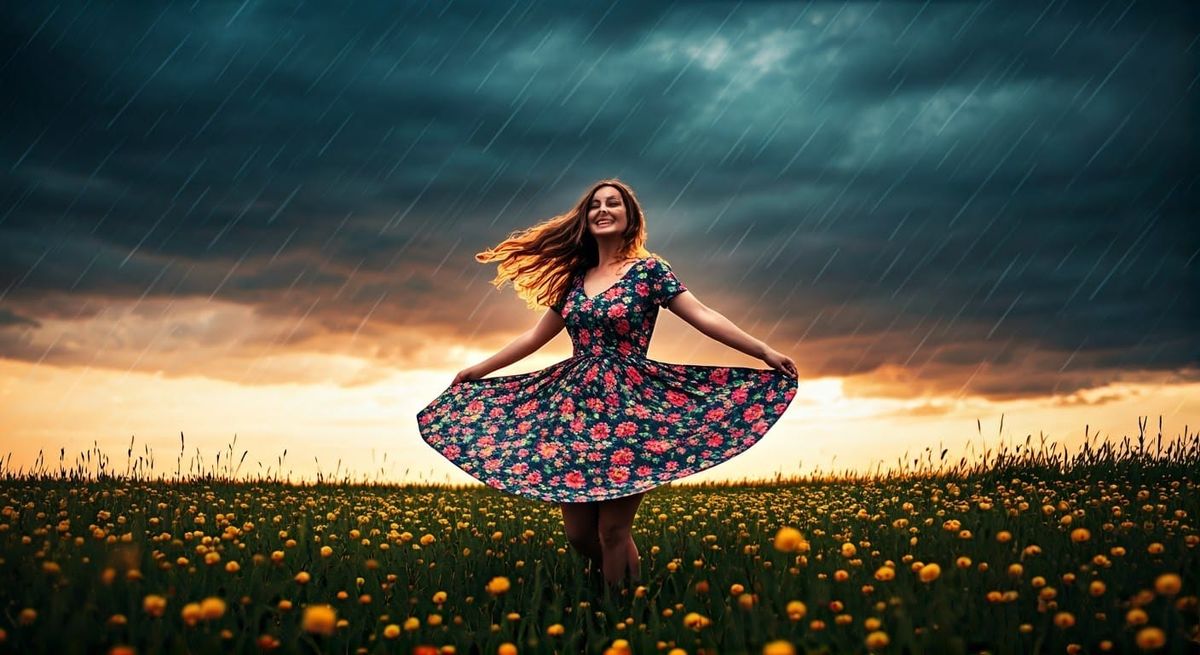 This image shows a joyful woman dancing in the rain amidst blooming flowers. The composition features cinematic colors, natural light, and a shallow depth of field, with a dreamlike quality reminiscent of watercolor art.