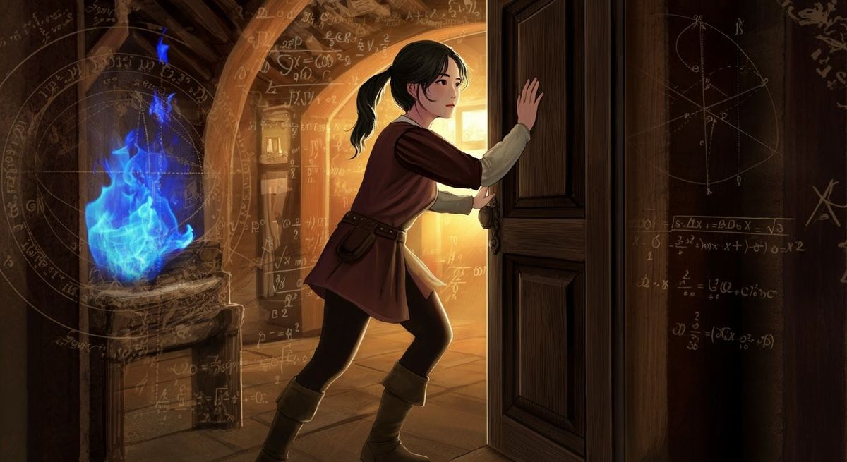 This image shows a Korean woman in Renaissance attire touching a door in an Italian farmhouse hallway. The scene includes blue fire, mathematical symbols, arcane markings, and intricate engraved details with warm lighting.