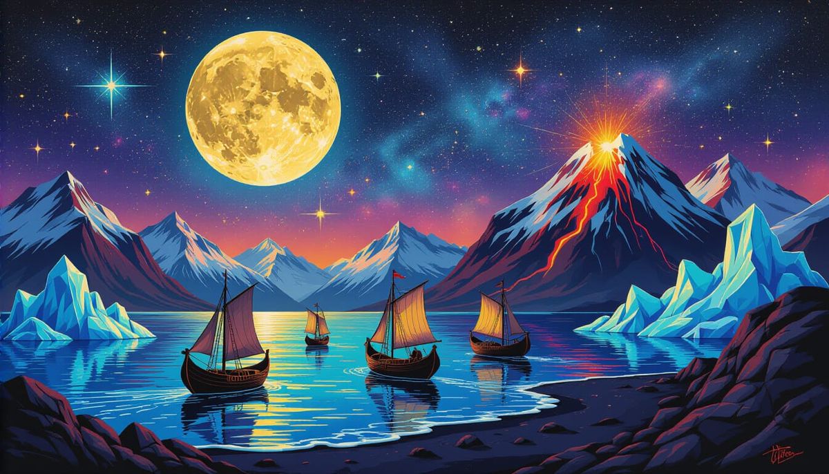 This image displays a detailed acrylic painting of a mystical medieval world map. It features Viking ships, icebergs, mountains, a glowing volcano, and a vibrant night sky with northern lights, all in a surreal, gothic style.