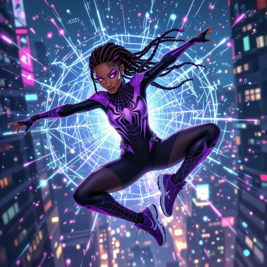 This image shows a Black female superhero with light brown skin in a purple and black suit. She is suspended mid-air on a building, dancing on a radiant energy web amidst a cosmic cityscape in a cyberpunk aesthetic.