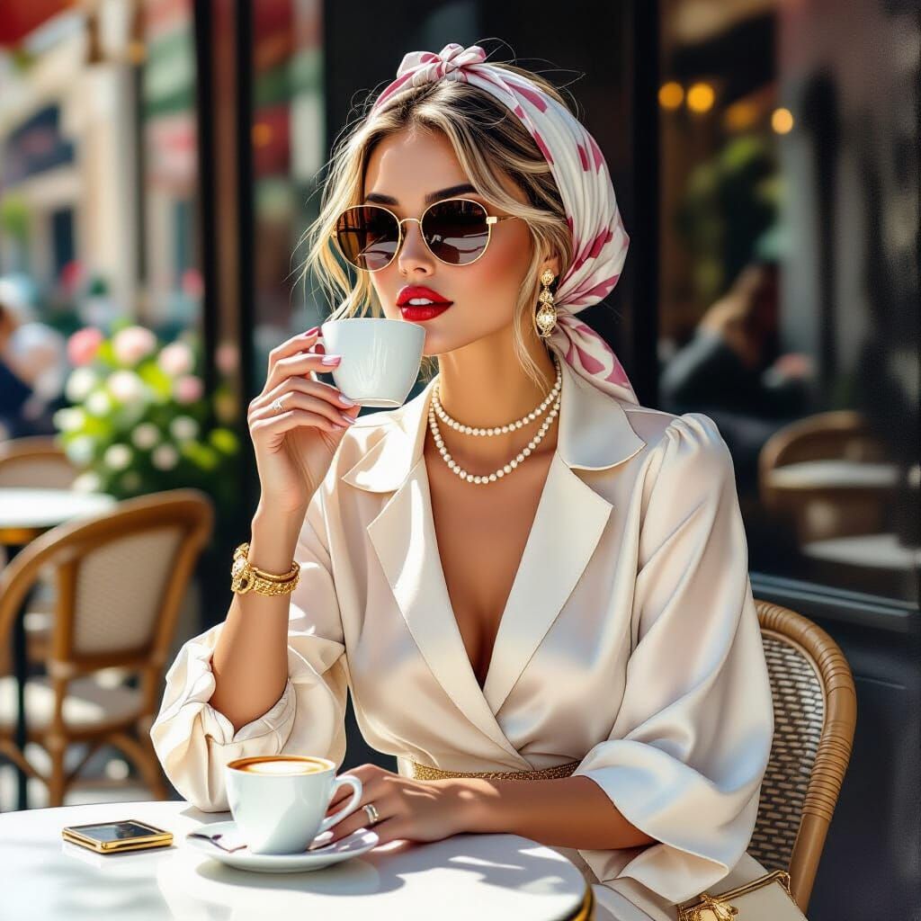 A striking picture of a woman enjoying iced espresso at an outdoor cafe. The image captures a timeless glamour with soft brush strokes and blended textures in an elegant art nouveau style.