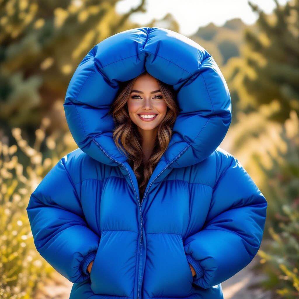 This image shows a young woman in an enormous blueberry-textured puffer suit. The high-fashion portrait, reminiscent of a cinematic editorial, is set in natural sunlight and features intricate details.