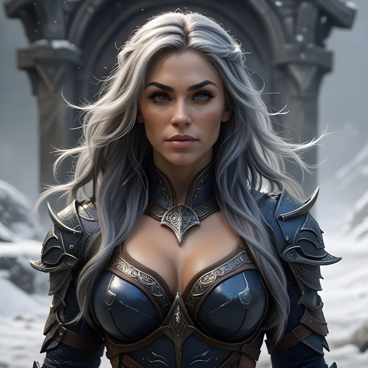 This image depicts a powerful female elf warrior clad in intricate bikini armor, standing resolute on the road to the orc prison. Her chiseled physique and determined expression convey a sense of triumph and serenity, as she looks out at the camera with a mix of emotions. In the background, the imposing ...