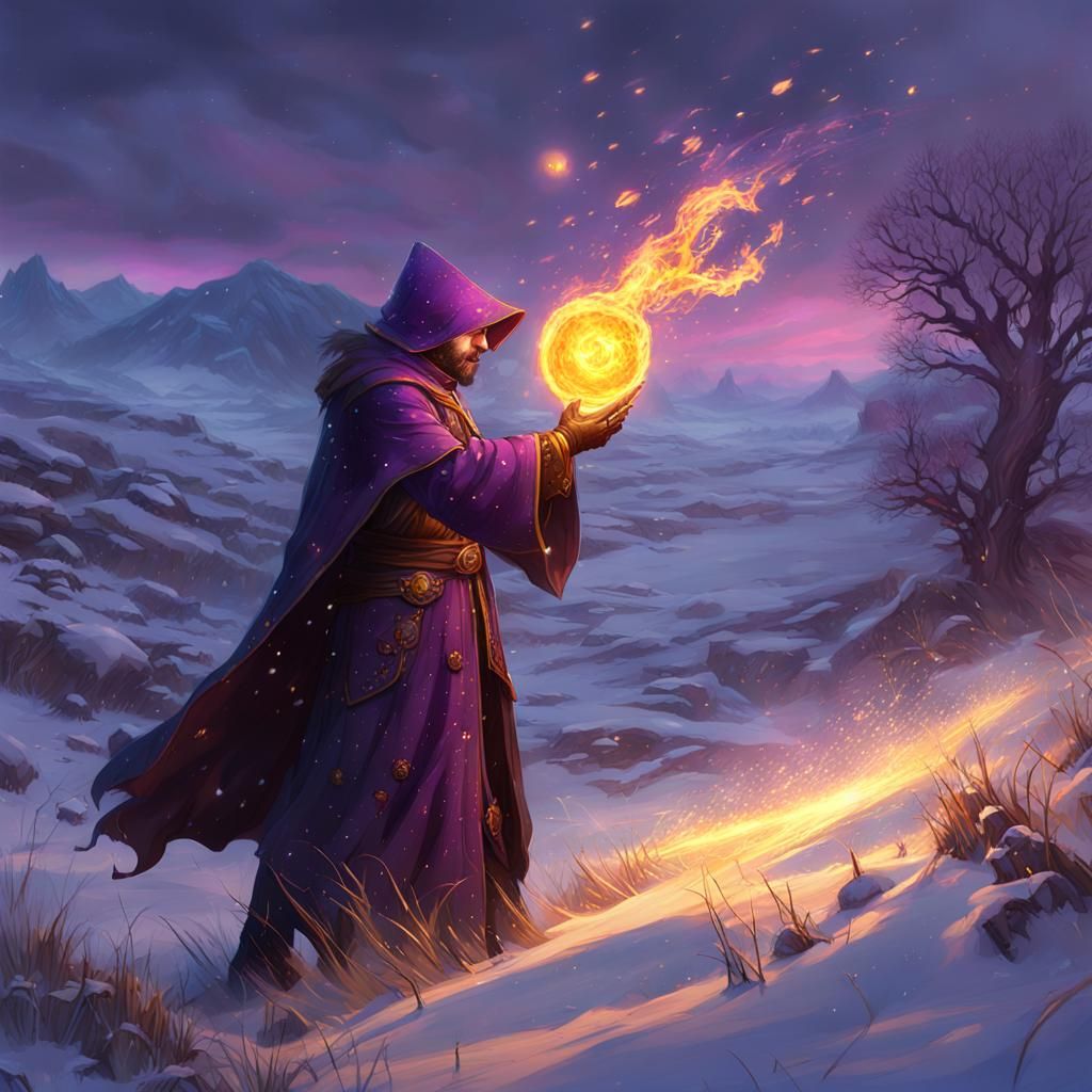 A wizard conjures a fiery spell in a snow-covered field. This digital artwork features dynamic lighting, rich colors, and intricate details in a dark fantasy style.