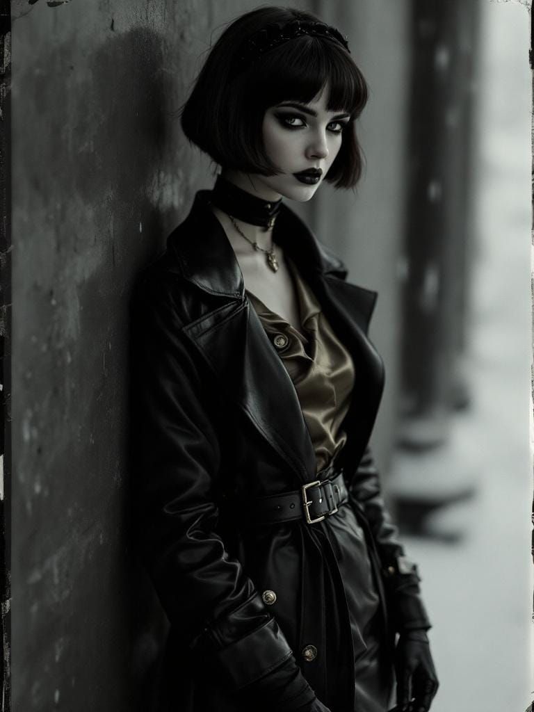 A haunting image of a British woman in vintage attire, evoking a 19th-century aesthetic. The portrait features dramatic lighting and exquisite detail, reminiscent of antique photography.