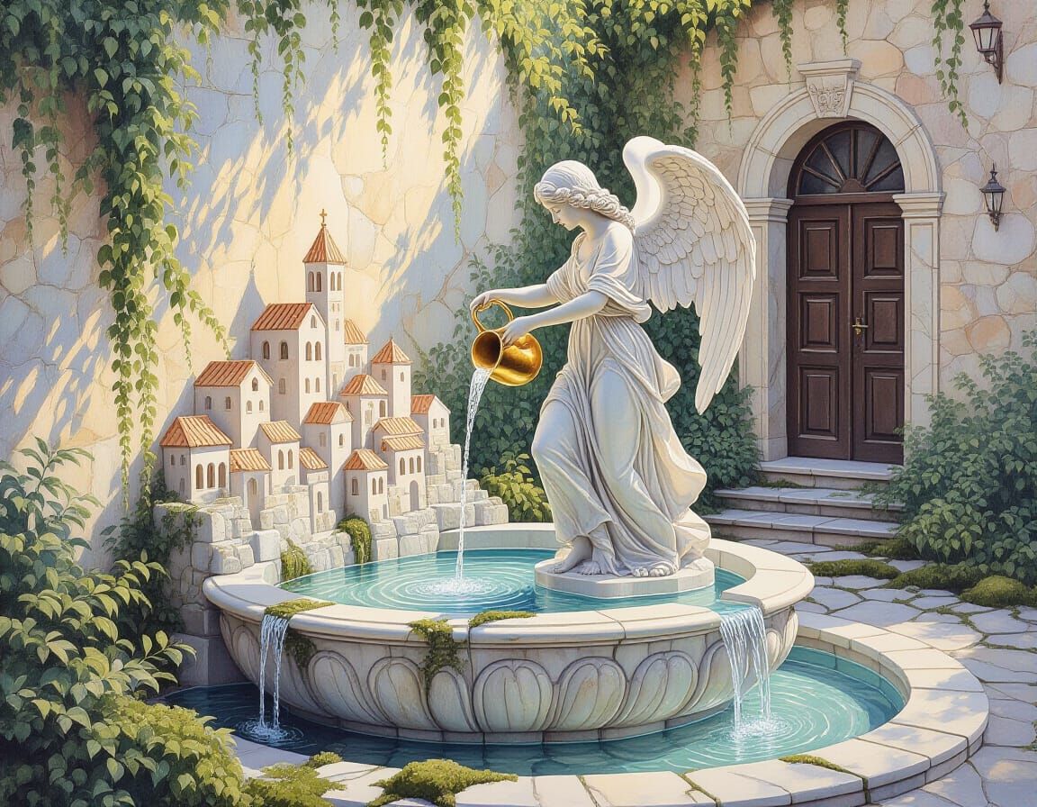 Soft, dreamy oil and watercolor painting, impressionistic brushstrokes, mystical ambiance, a carved marble angel shaped fountain. Made of flowing marble, a carved marble angel pours water out of a golden pitcher, the water cascading over a mini town chiseled out of marble, magical atmosphere, intricate ...