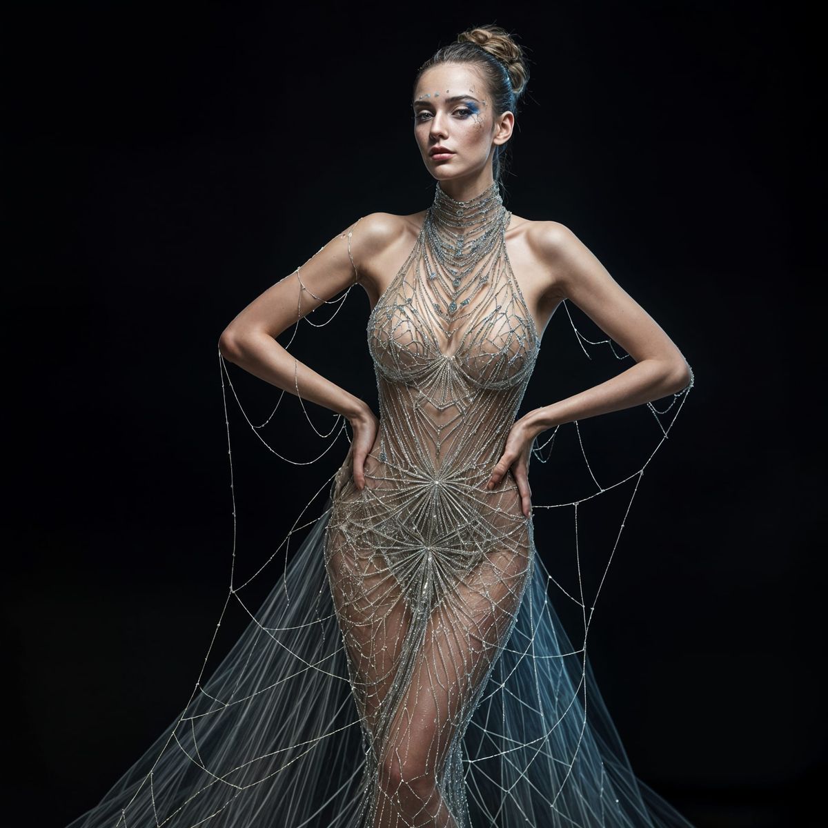 A striking image of a fashion model wearing an outfit crafted entirely from luminous spider silk, glistening with morning dew.