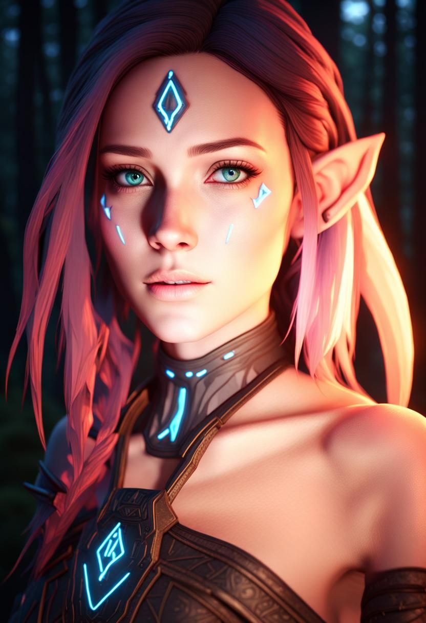 This image shows a female Na'vi avatar with glowing neon runes in a dark forest. The character is rendered with intricate detail, dynamic lighting, and a cinematic feel.