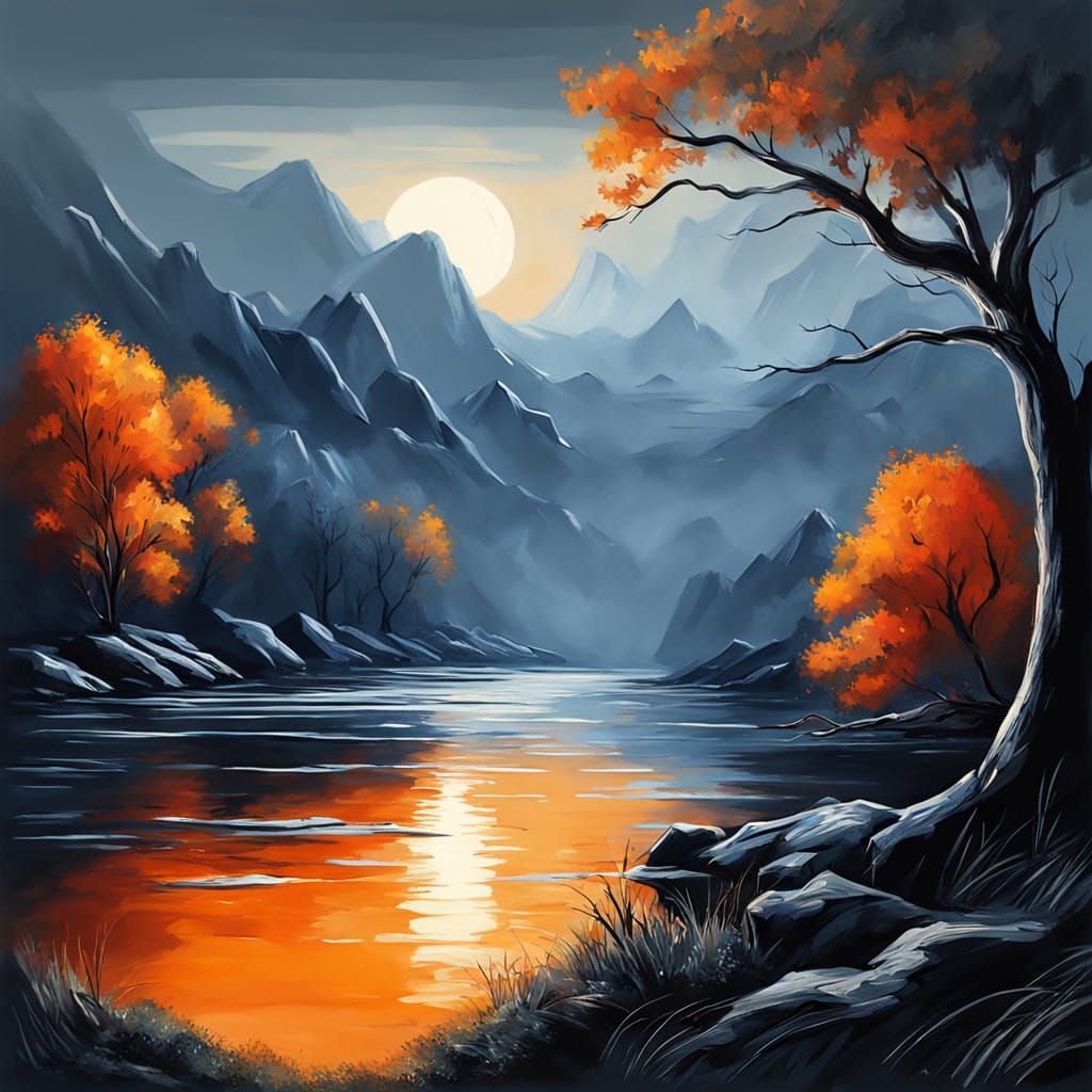 A vibrant fantasy landscape rendered in charcoal. The close-up shot showcases thick brush strokes, rich textures, and a blend of deep blues and oranges in an expressionist style.