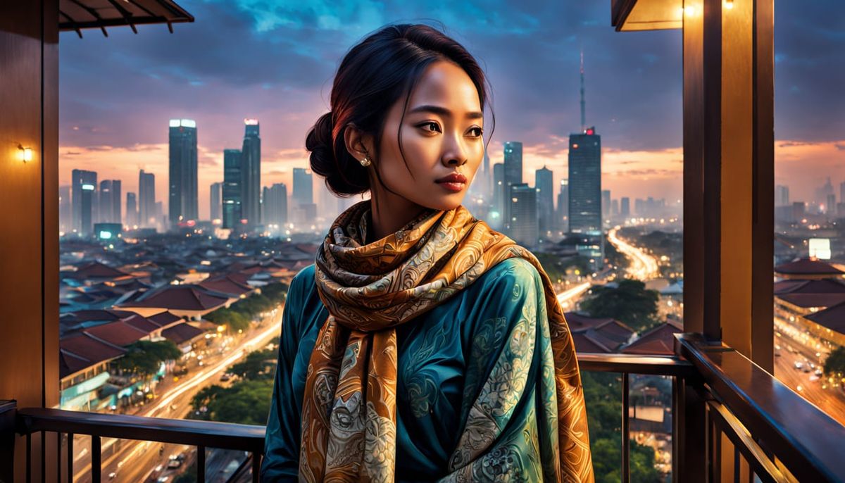 A striking picture of an Indonesian woman on a balcony overlooking Jakarta. She wears a modern dress and batik scarf, illuminated by neon city lights in a vibrant, detailed digital painting.