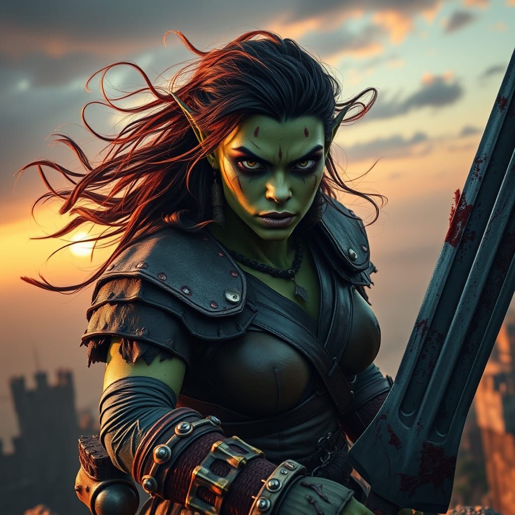 This image shows an orc woman warrior standing on a fortress after a battle. She is armored and battle-worn, holding a greatsword. The scene is lit by a setting sun, rendered with intricate details in a fantasy art style.