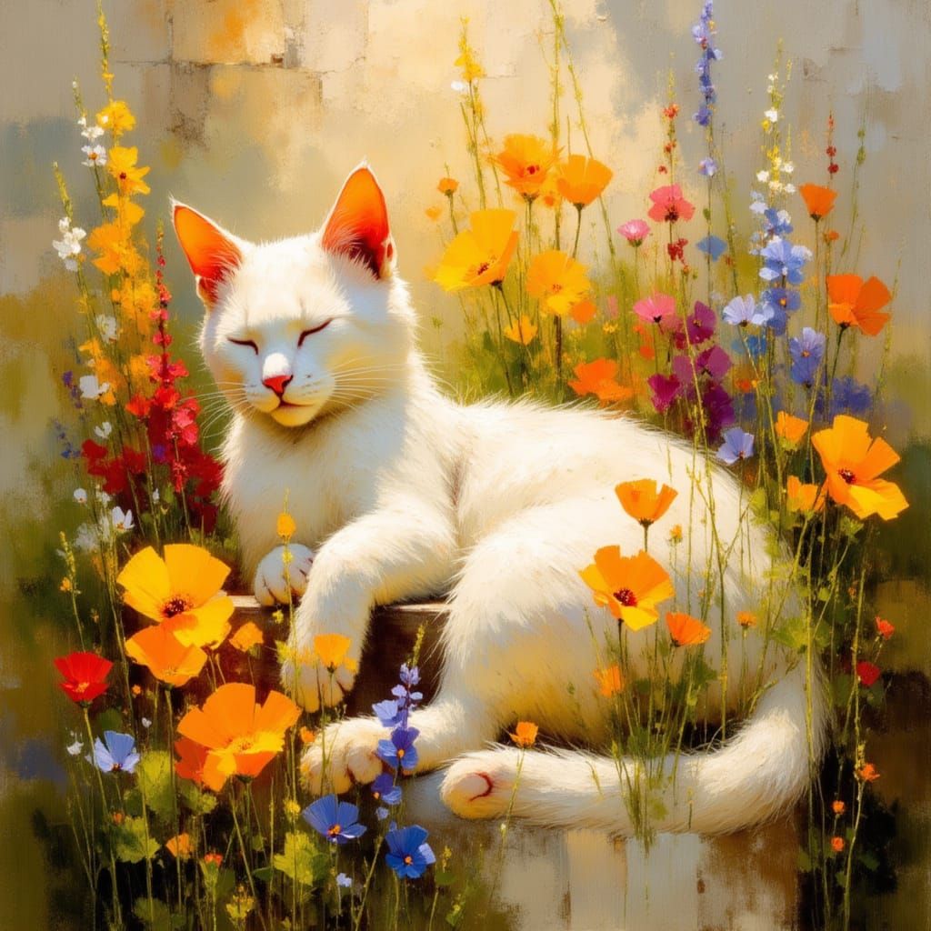 A sleeping cat surrounded by colorful wildflowers, a bright and sunny day. Impressionistic.