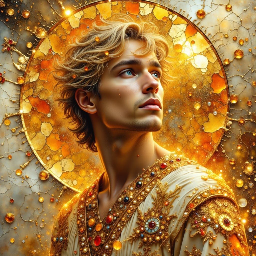 This image shows a handsome man in a luxurious, golden-hued atmosphere, adorned with vibrant orange gems and pearls, set against a celestial backdrop of shimmering gold particles and a majestic sun disk with a crackled, metallic texture.