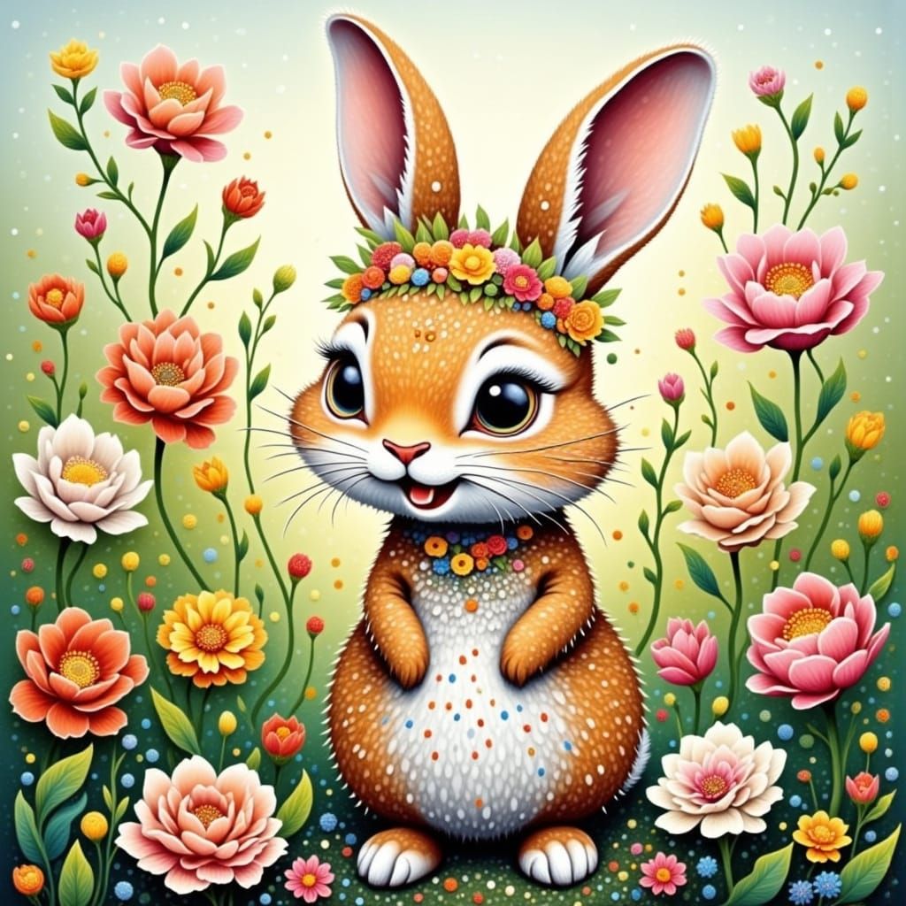 A charming image of a bunny amidst vibrant flowers. The scene evokes a sense of whimsy and joy, reminiscent of classic children's book illustrations, with a delicate and dreamy aesthetic.