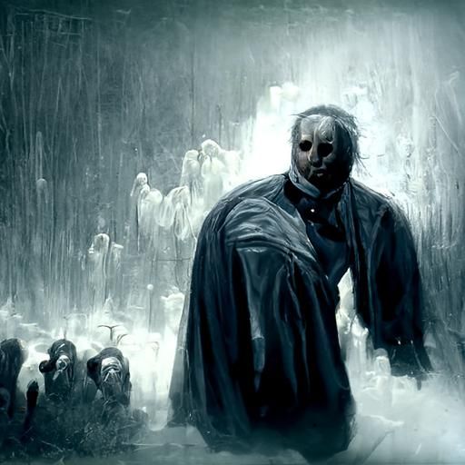 This image shows Micheal Myers in a horror-themed scene. The artwork features dramatic lighting reminiscent of wood engraving, with a modern digital painting aesthetic.
