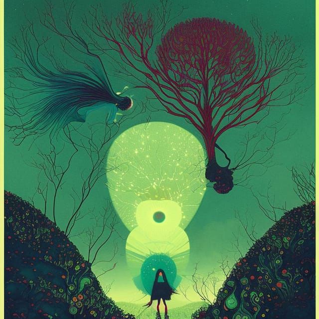 This image shows a psychedelic underwater scene with vibrant colors and surreal elements. The artwork evokes a sense of altered perception, reminiscent of comic book art.
