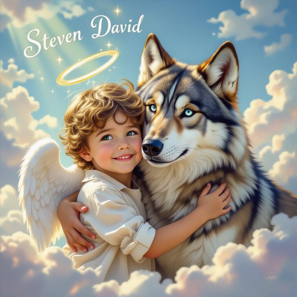 This image shows a cherubic 2-year-old boy with opalescent wings, embraced by a blue-eyed wolf in bright sunshine. The artwork is reminiscent of classical paintings with soft colors.