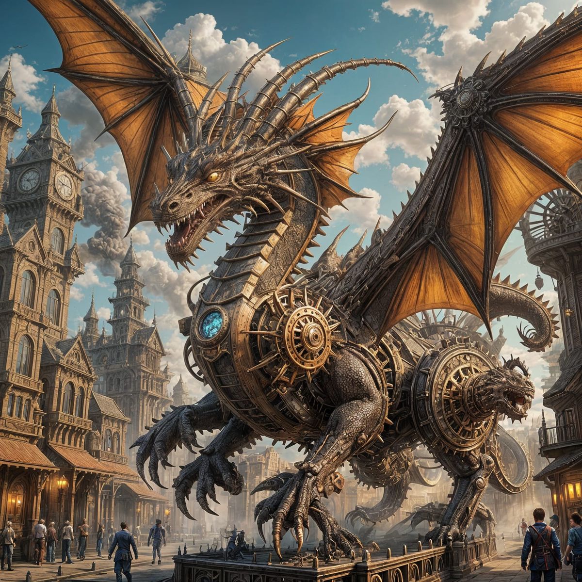 This image shows a mechanical dragon soaring through a steampunk city. The dragon features intricate gears and clockwork wings, with cogs and steam filling the air in a hyperrealistic digital painting.