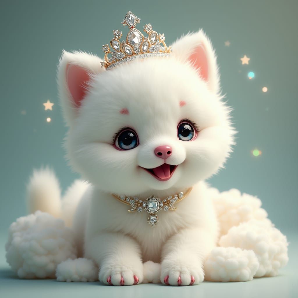 This enchanting image depicts a delicate Bichon Frise puppy wearing a sparkling tiara, seated on a cloud throne amidst a whimsical, Art Nouveau-inspired setting with intricate textures and vibrant triadic colors.