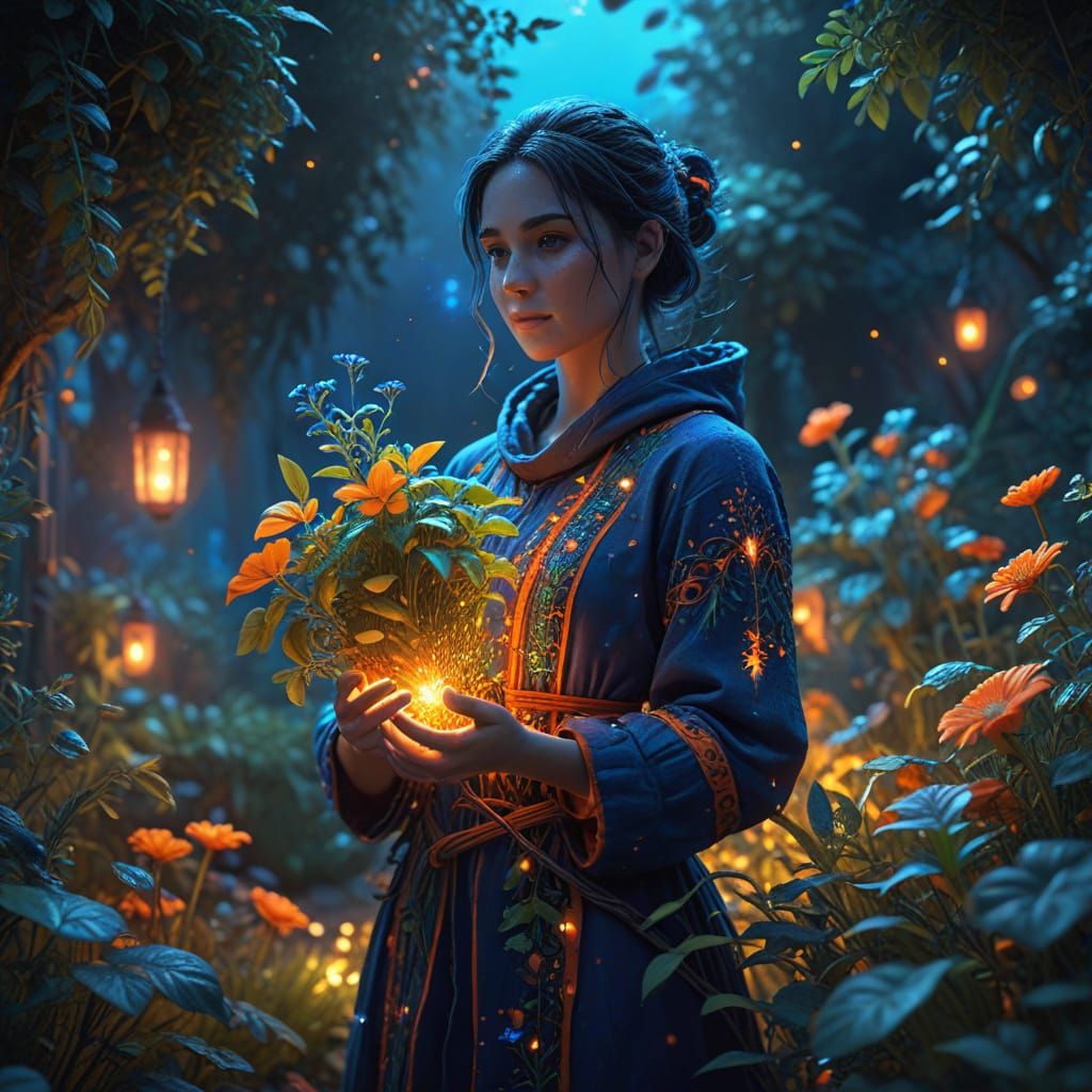 A person stands in a lush garden holding fresh herbs. The image features soft, glowing light and a vivid color palette of deep blues and oranges. Rendered with detailed matte painting techniques.
