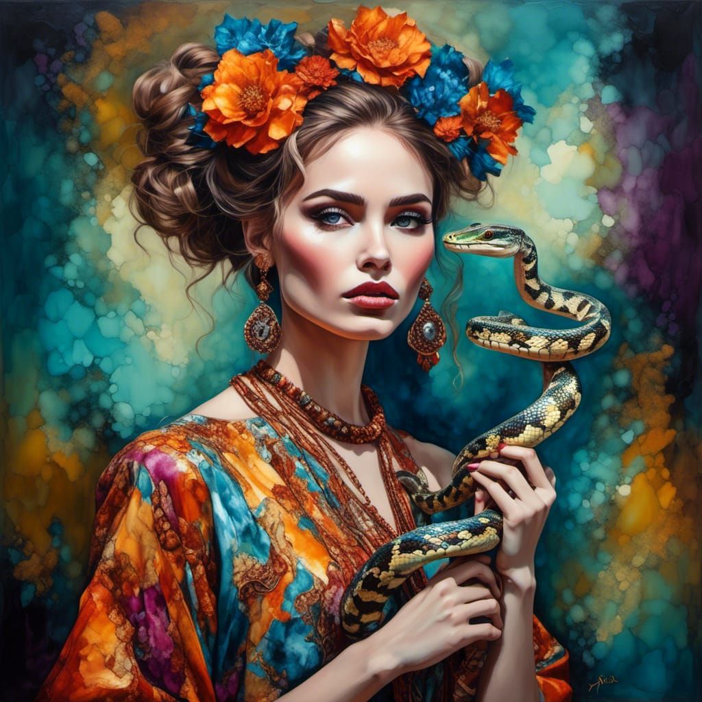 This image shows a hyperrealistic portrait of a beautiful woman with a python. She wears intricately detailed, colorful clothing, rendered with photorealistic textures.