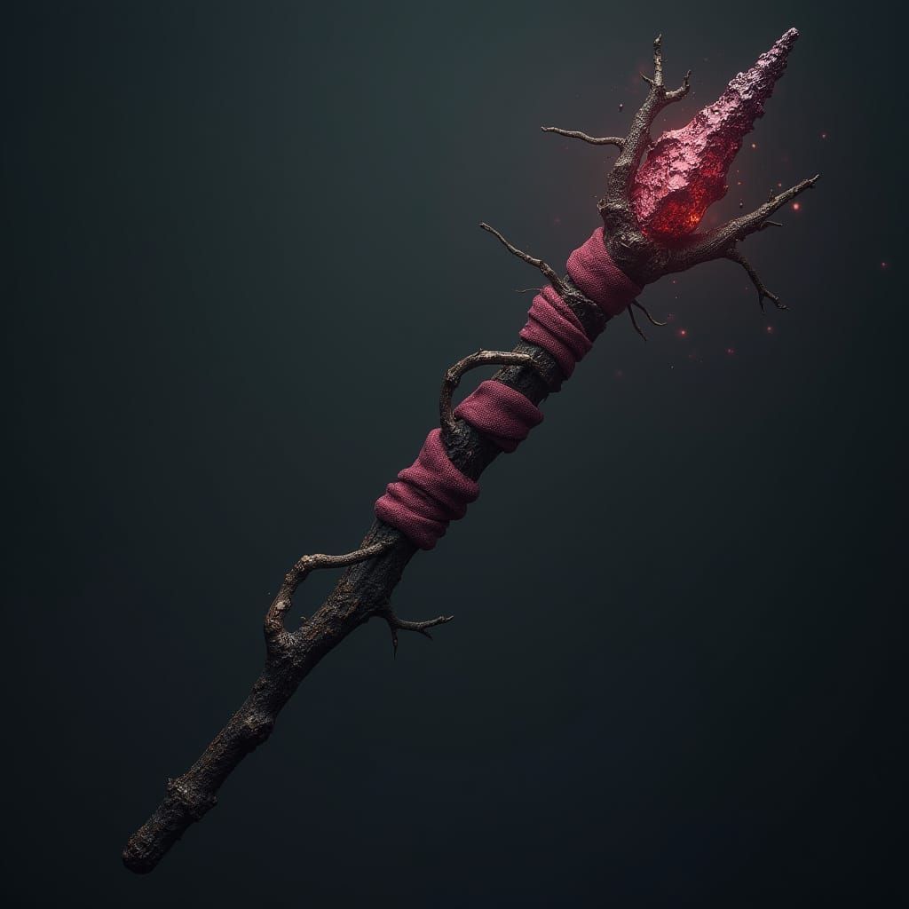 A striking picture of a dark, jagged willow wand wrapped with worn cloth. The wand is infused with unicorn blood and rendered with rich colors and intricate details in a fantastical digital painting style.