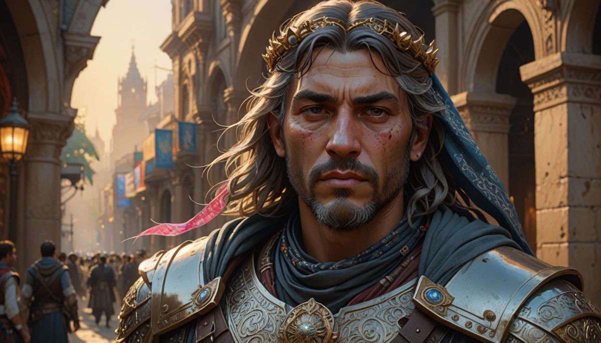This image shows a weary prince in traditional Middle Eastern attire with ornate armor. The portrait features dynamic lighting and a vibrant color palette, rendered as detailed digital artwork.