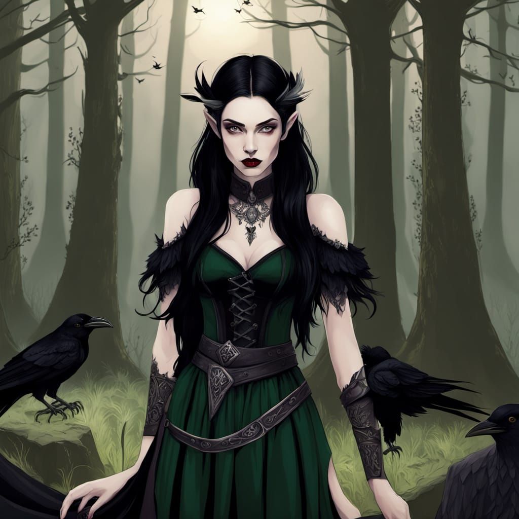 This enchanting portrait features a mystical female elf with striking features and intricate gothic details, set against a moody, atmospheric backdrop.