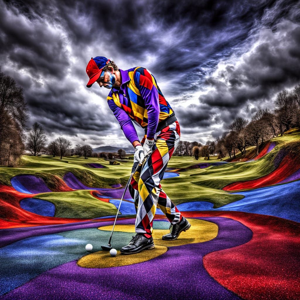 A vibrant image depicts a harlequin playing golf. The scene incorporates fractal and Fibonacci sequences, with polka dots and a bold color palette to create an eye-catching, detailed image.