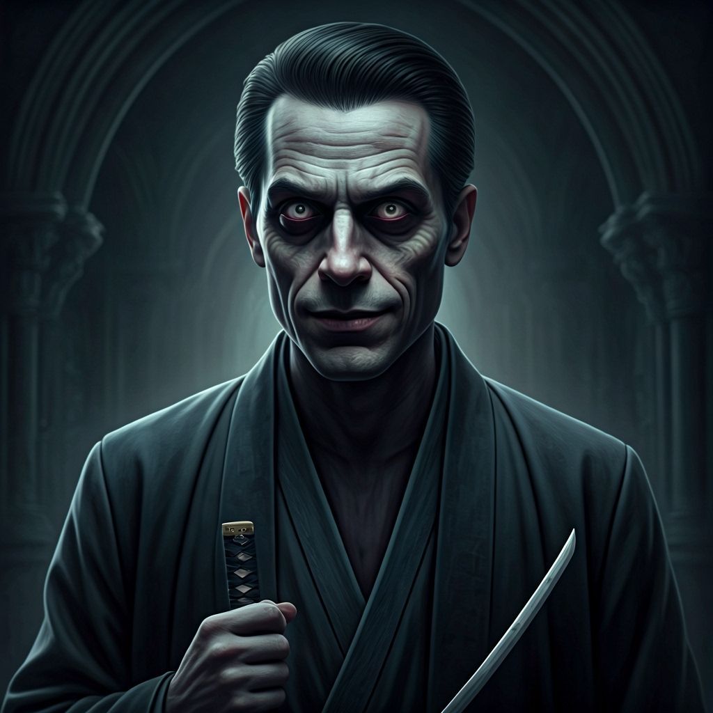 This image shows a chilling ghostly man holding a katana. The subject's dark eyes and sinister smile create a menacing atmosphere, inspired by dark and moody styles with photorealistic lighting and ominous shadows.