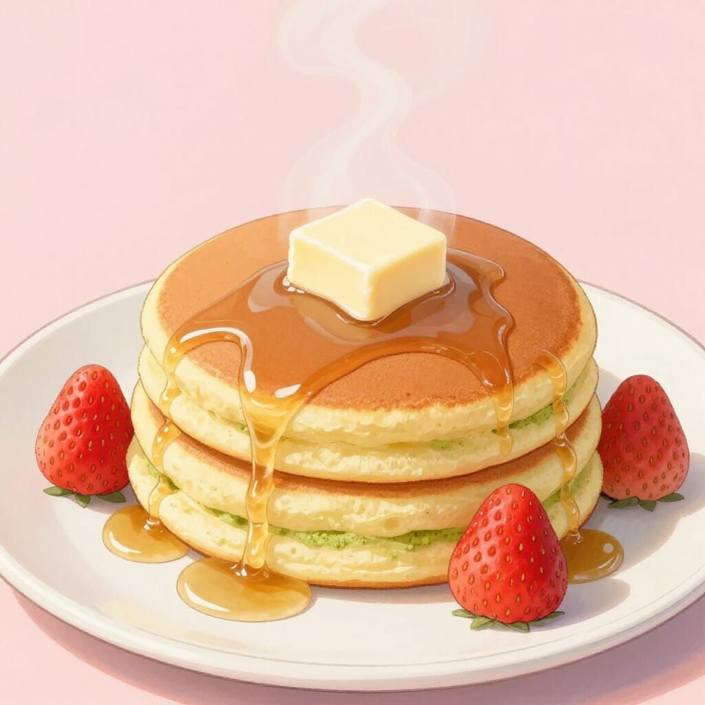This image features fluffy Japanese strawberry matcha pancakes, generously drizzled with syrup and topped with melting butter. Rendered in a soft, illustrative style with rich textures and a pastel palette.