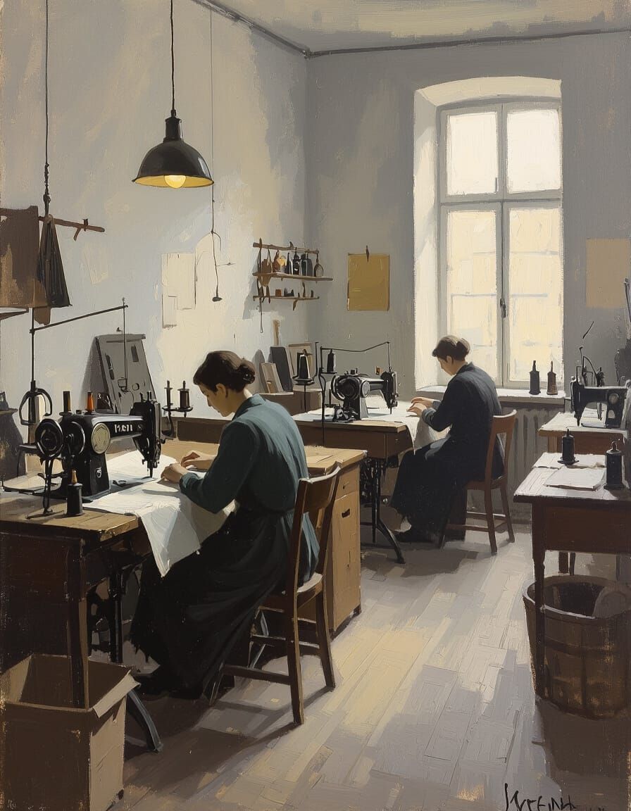 This image depicts a quiet, vintage sewing shop with old equipment and somber figures, rendered in a realistic oil painting style with subtle textures and warm, neutral colors.