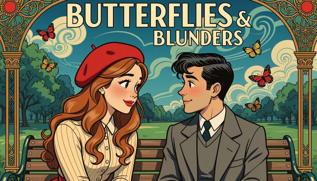 This image depicts a close-up of a woman blushing while talking to a man on a park bench. Butterflies surround them, with art deco text and patterns overhead, in a surreal and futuristic aesthetic.