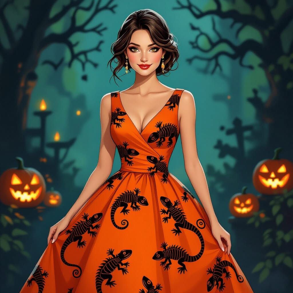 This image showcases a woman in an elegant orange Halloween dress adorned with a lizard print. She is depicted in a warmly lit, atmospheric setting with jack-o'-lanterns, presented in a whimsical storybook illustration style with rich textures and enchanting colors.
