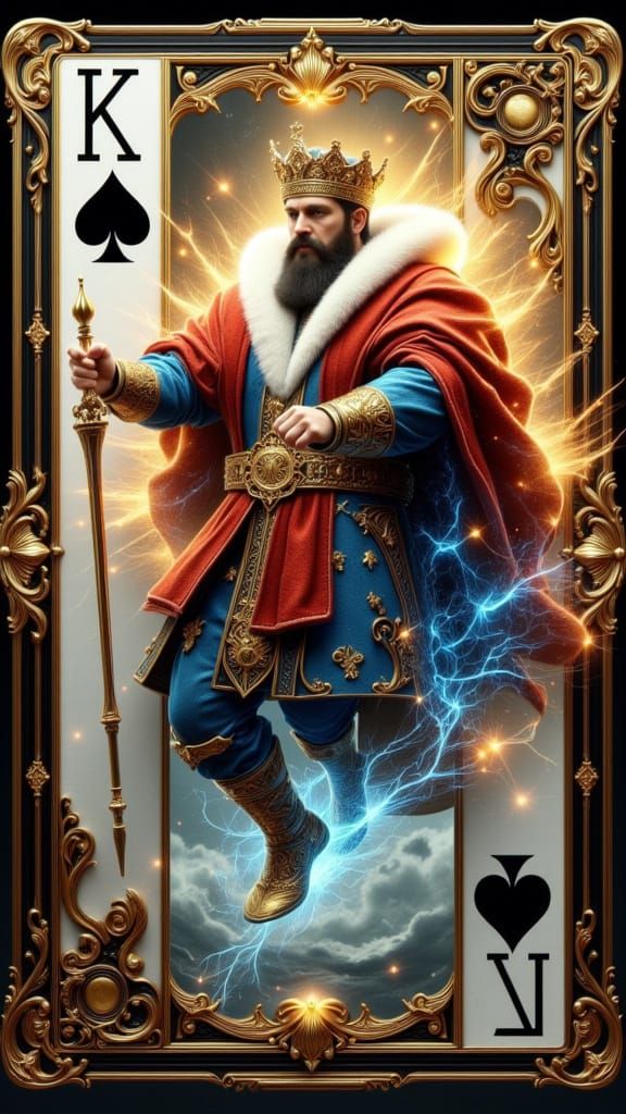 A striking picture of a steampunk king bursting through a playing card to seize his sceptre. The image is a watercolour portrait with 3D holographic elements, framed in ornate black and gold.