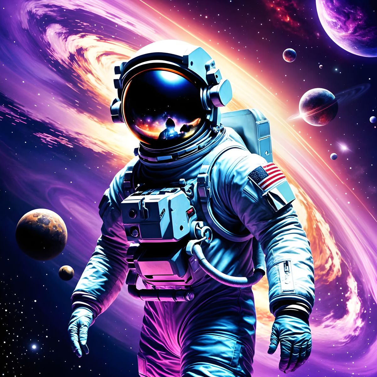 This image shows a lone astronaut navigating through a stunning, star-filled galaxy. Created in a cosmic, otherworldly aesthetic.