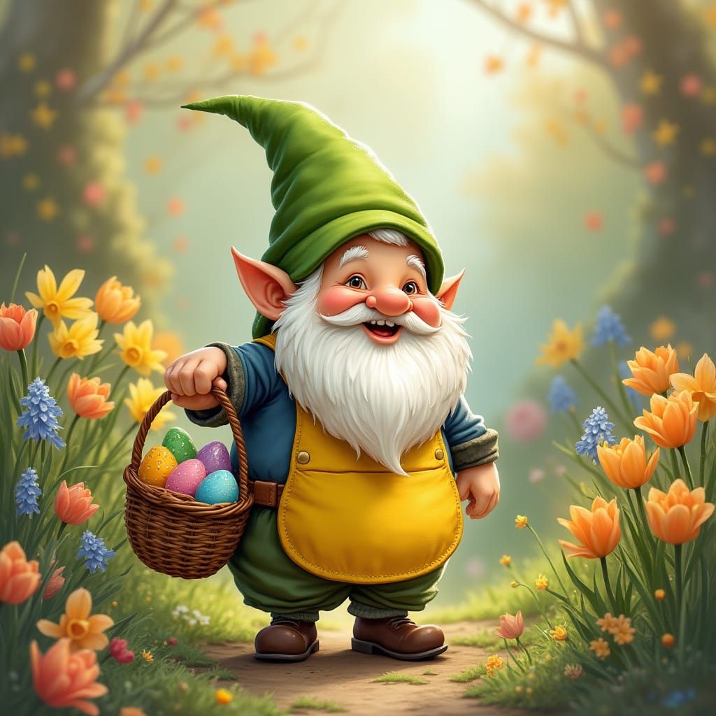 This image shows a small, rotund gnome amidst a lush garden, surrounded by blooming flowers and the warm light of a sunny spring morning, in a whimsical, fantasy style