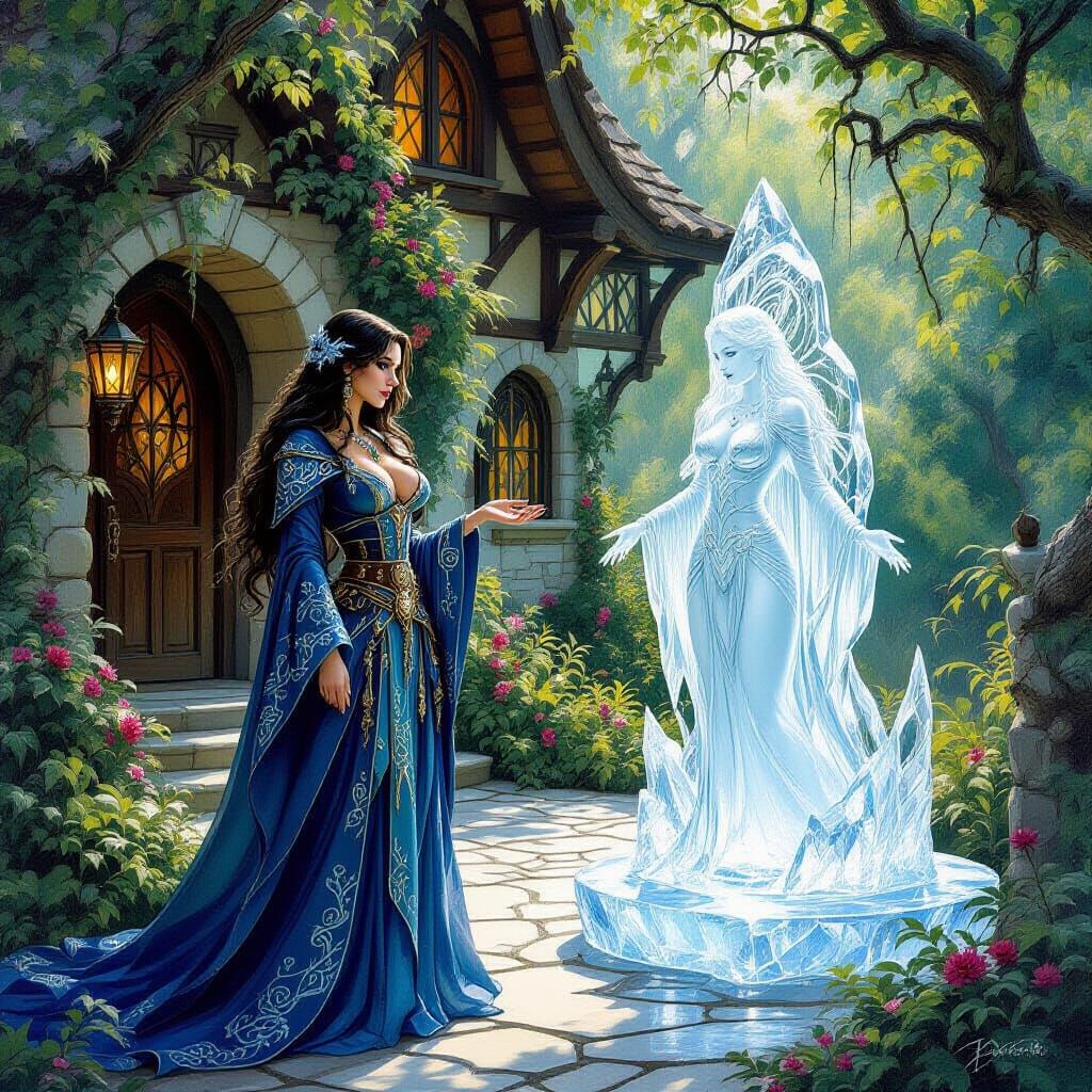 This image shows a sorceress in elaborate robes outside a fantasy inn. In front of her is an ice sculpture that mirrors her likeness, all rendered in a detailed fantasy oil painting style.