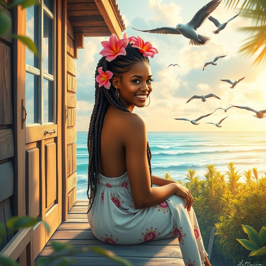 A softly lit image of a serene Jamaican woman on a cottage step. She gazes at the turquoise ocean with a gentle smile, in an art nouveau style with watercolor textures.