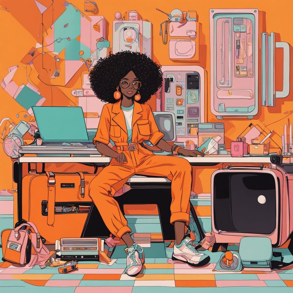 This image showcases a stylized collectible action figure box featuring Maintenance Millie in a dynamic pose, surrounded by miniature accessories and a bold pastel color palette with thick, clean lines and high contrast lighting.