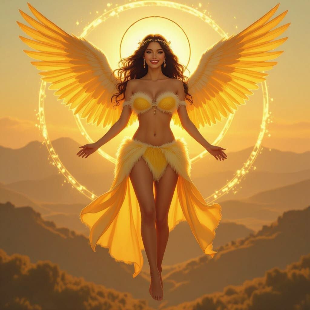This image shows an elegant angel woman with a warm smile and yellow wings, floating in a serene, golden sunrise. The image features intricate details blending realism and mythological elements, reminiscent of art nouveau.
