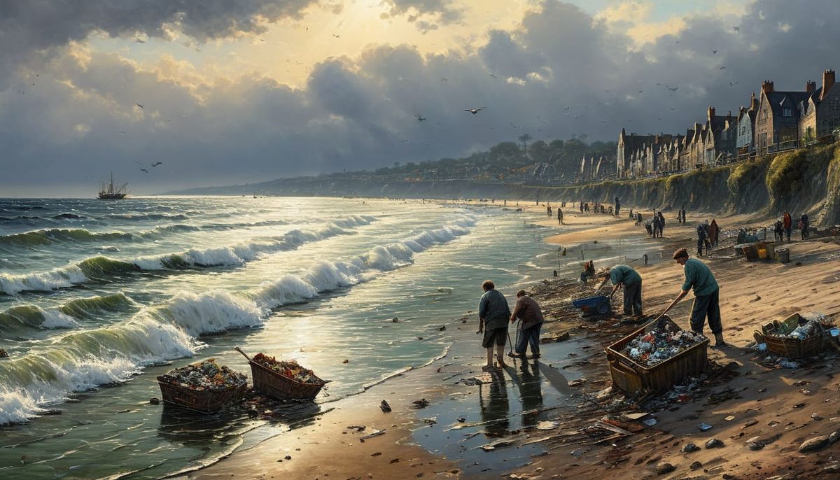 A vibrant oil painting depicting people cleaning a beach. The artwork showcases impressionistic watercolor techniques and vivid colors, reminiscent of fine art.