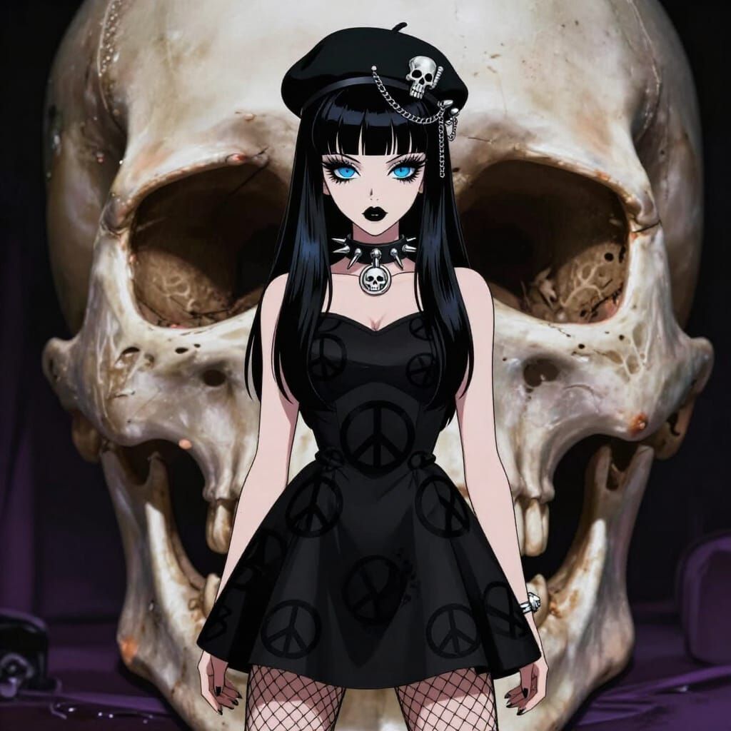 A anime illistration young woman with a 1960s mod meets deathcore metal aesthetic: pale skin, neon blue pupils, dramatic 60s doll eyes with thick black winged eyeliner, heavy white eyeshadow, false lashes top and bottom, sharp brows, matte black lips. Long jet-black hair with choppy layers and voluminous ...