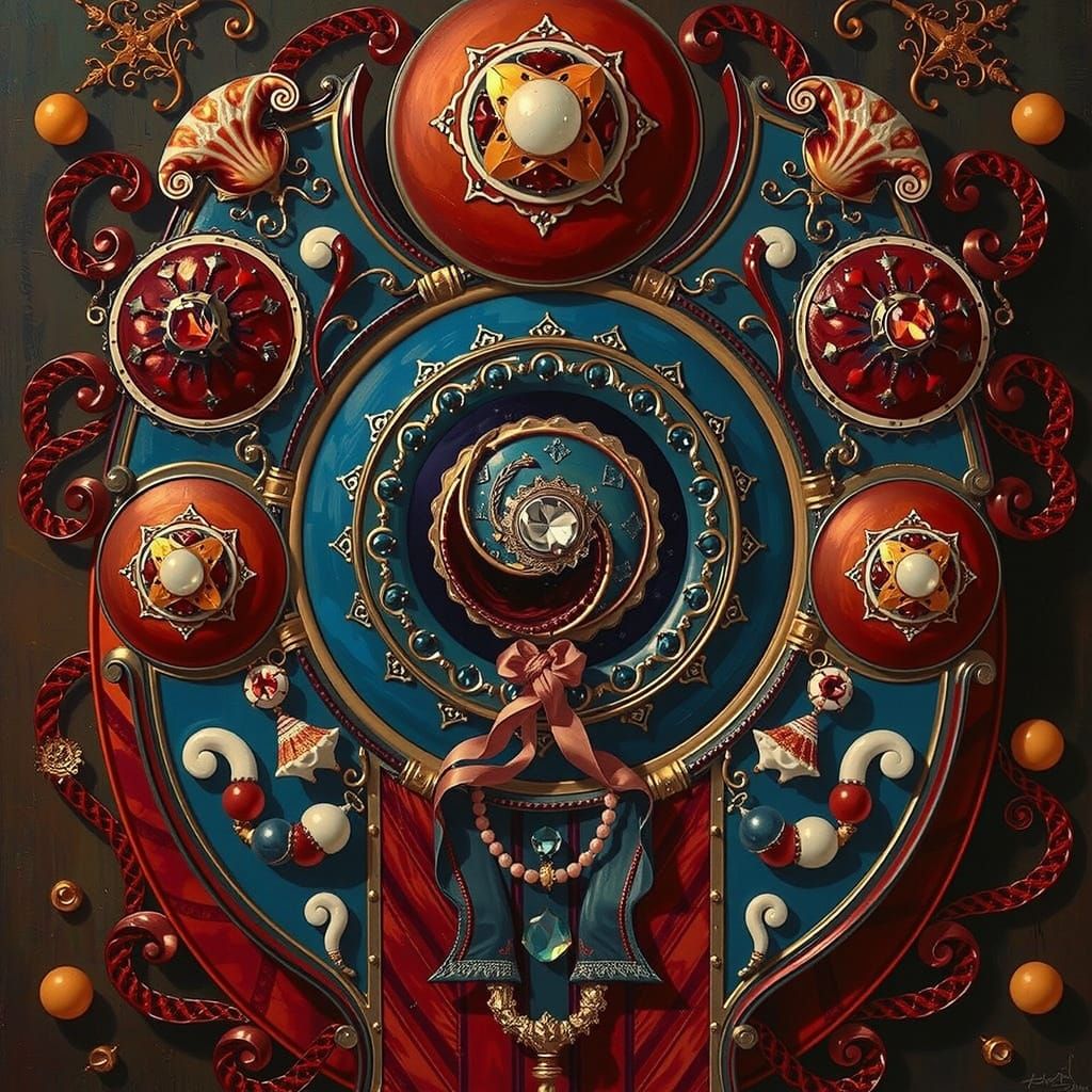 This hyperdetailed image showcases vibrant gelato colors with stripes, pearls, seashells, and precious jewels in a striking, realistic style.
