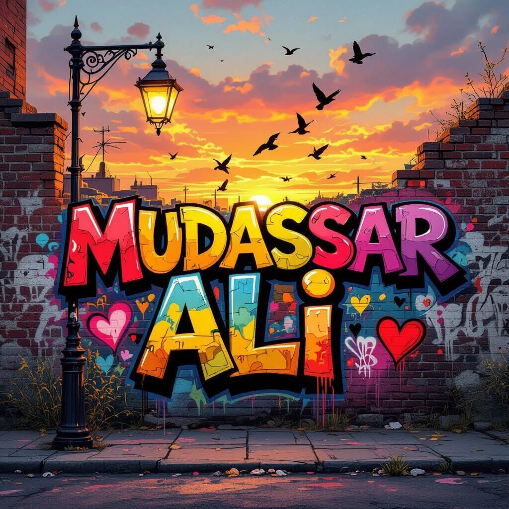 A vibrant graffiti mural of the name 'Mudassar Ali' on a weathered brick wall. The artwork is in a painterly digital style, featuring a sunset backdrop, birds, and urban-inspired details.