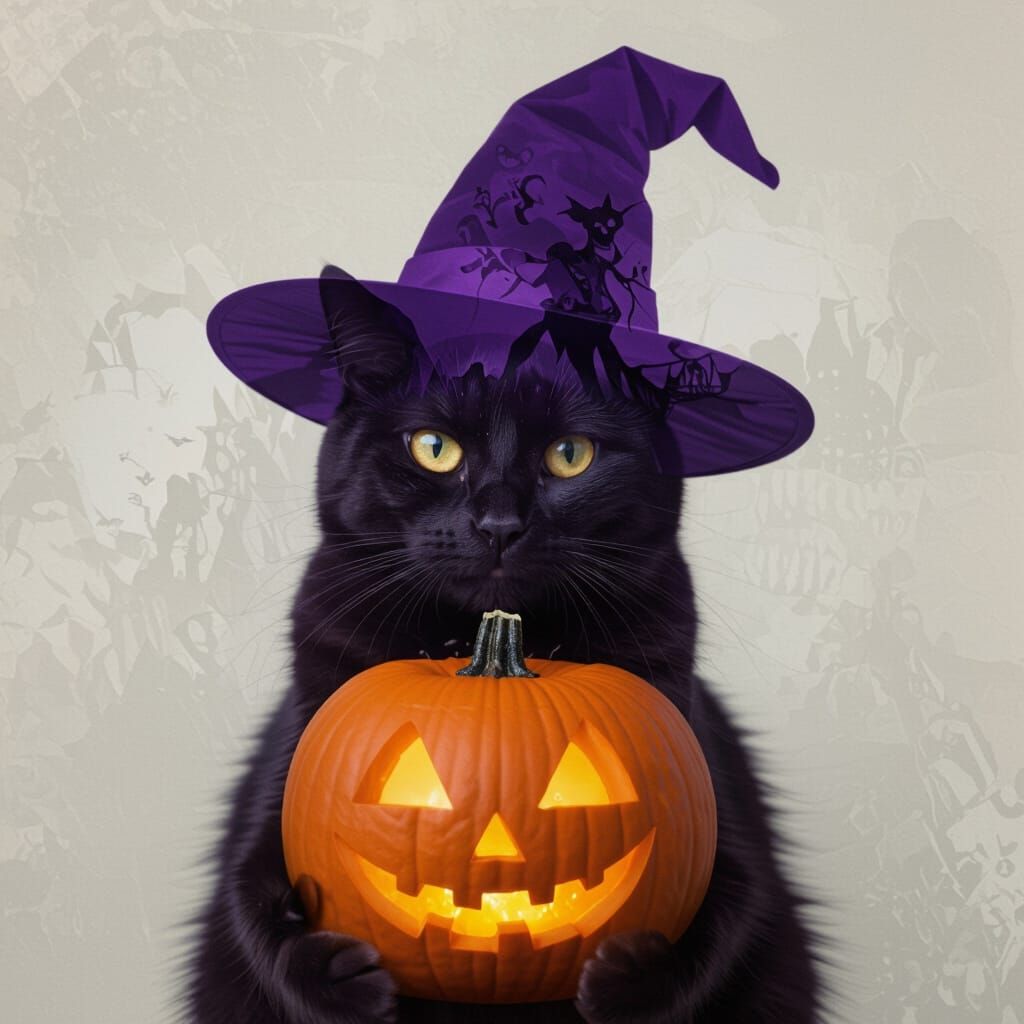 This image features a Halloween cat combined with a witch and pumpkin in a spooky double exposure effect, using vibrant purple and orange colors.