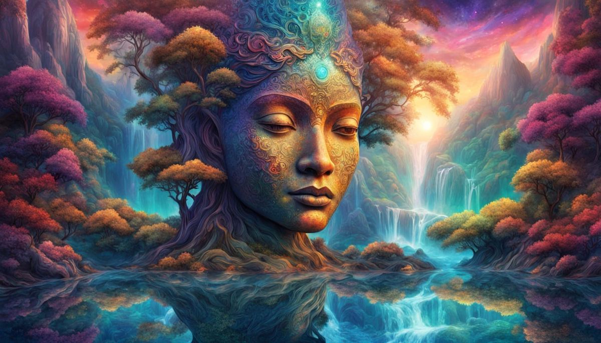 A mesmerizing hyperrealistic splash art featuring a half-finished female head statue carved into a rock face, surrounded by a mystical mountain range, dark clouds, and a hint of sunlight. The image exudes a dreamy, ethereal atmosphere with vibrant, cosmic colors and intricate textures.