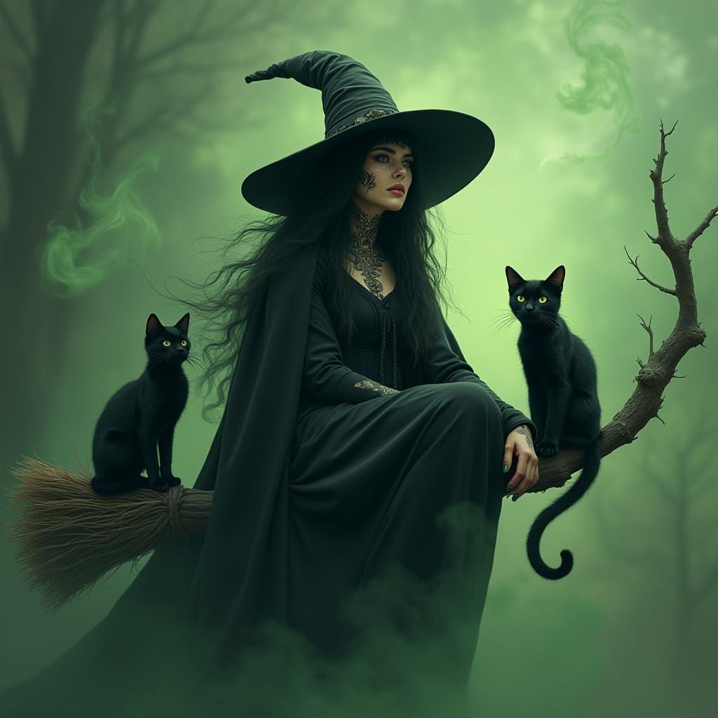 A captivating image of a witch with tribal tattoos riding a broomstick amidst swirling green smoke, accompanied by two black cats. The artwork is reminiscent of dark, whimsical digital art.