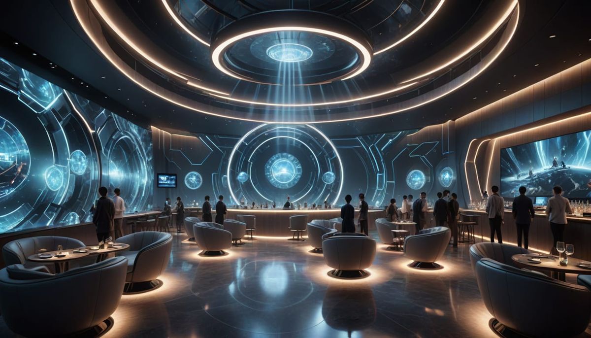 Experience a futuristic concert venue where AI bartenders serve glowing cocktails and sleek pods deliver snacks. This hyper-realistic scene blends ancient symbols with modern tech.